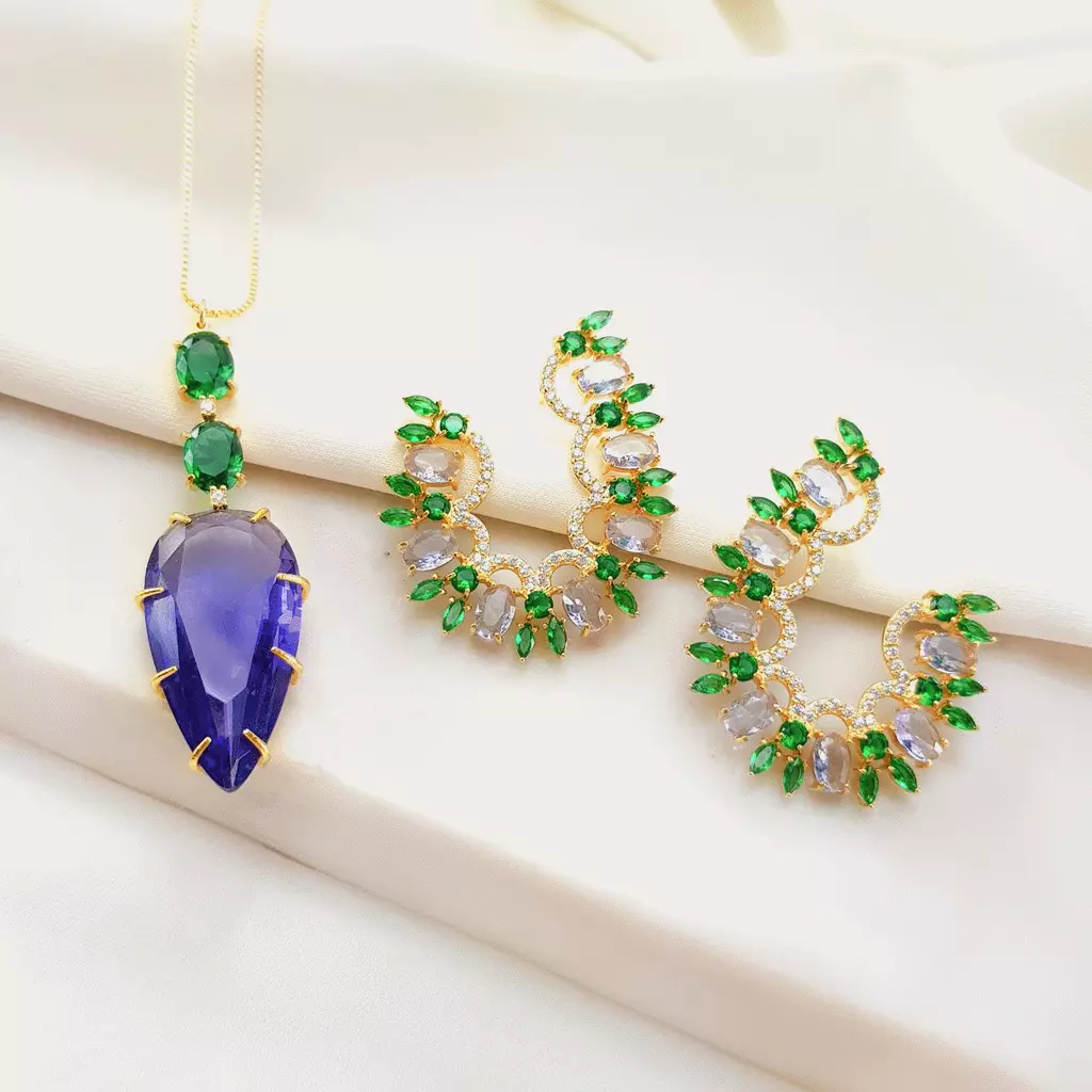 BRINCO OVAL MEDIO CRAVEJADO PEDRAS VERDE E LILÁS