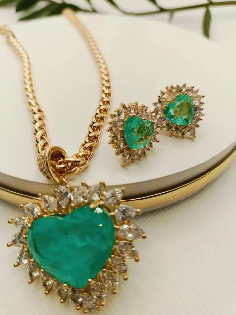 CONJUNTO COLAR E BRINCO CORAÇÃO TURMALINA VERDE BORDA GOTA ZIRCONIA