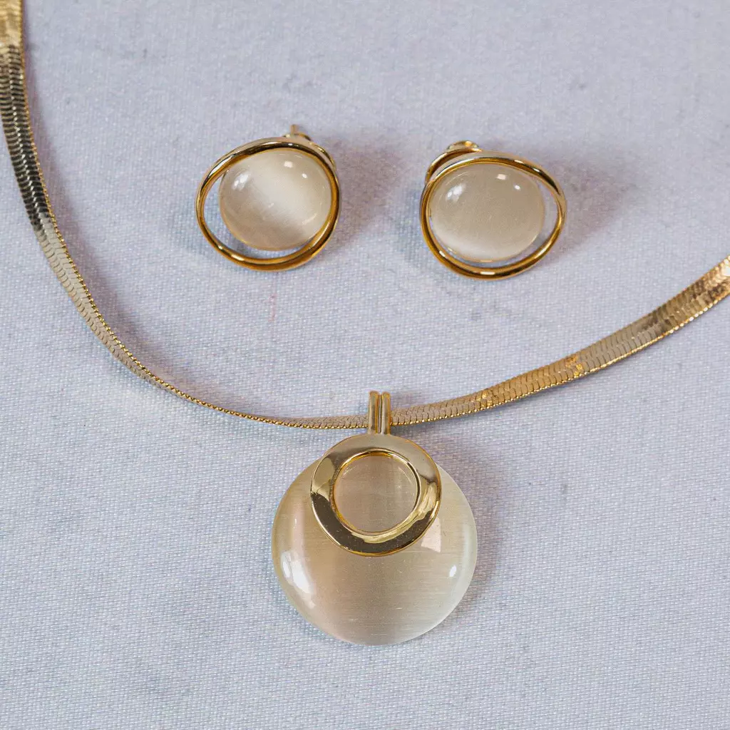 CONJUNTO COLAR E BRINCO MADRE PEROLA OLHO DE GATO DOURADO